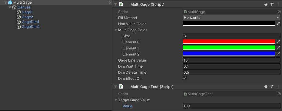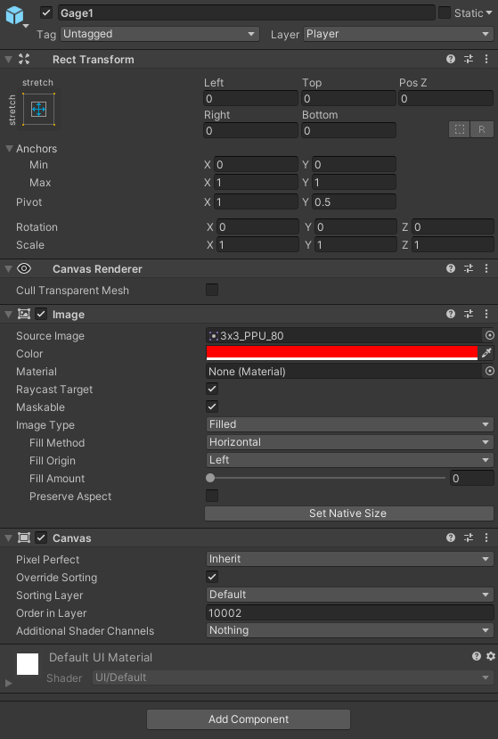 Gage1, Gage2, GageDim1, GageDim2은 위와 동일하다. 기본적으로 사용자는 RectTransform으로 형태만 본인 입맛에 맞게 조절해주면 되고 Image와 Canvas 컴포넌트는 달려만있으면 된다. Image와 Canvas 컴포넌트의 설정값은 코드에서 변경해준다.