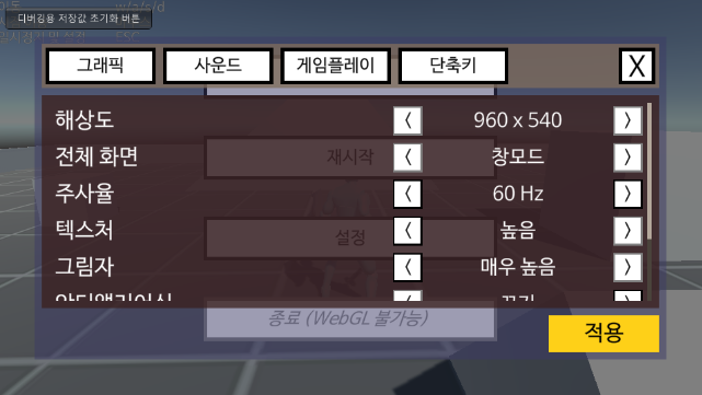 종료는 Web GL 플랫폼에선 비활성화되도록 해놓았다. 다른 플랫폼에선 작동한다.